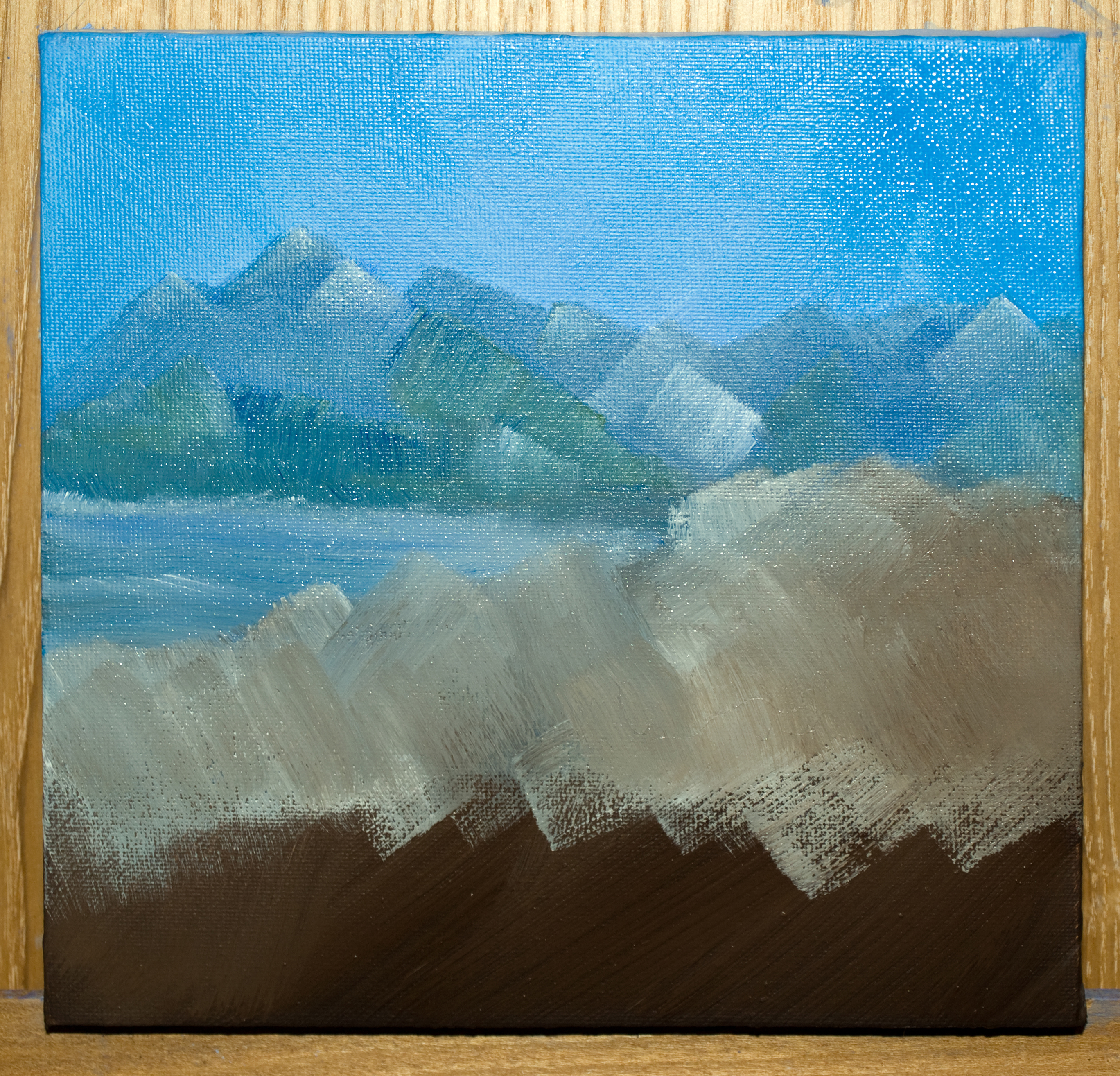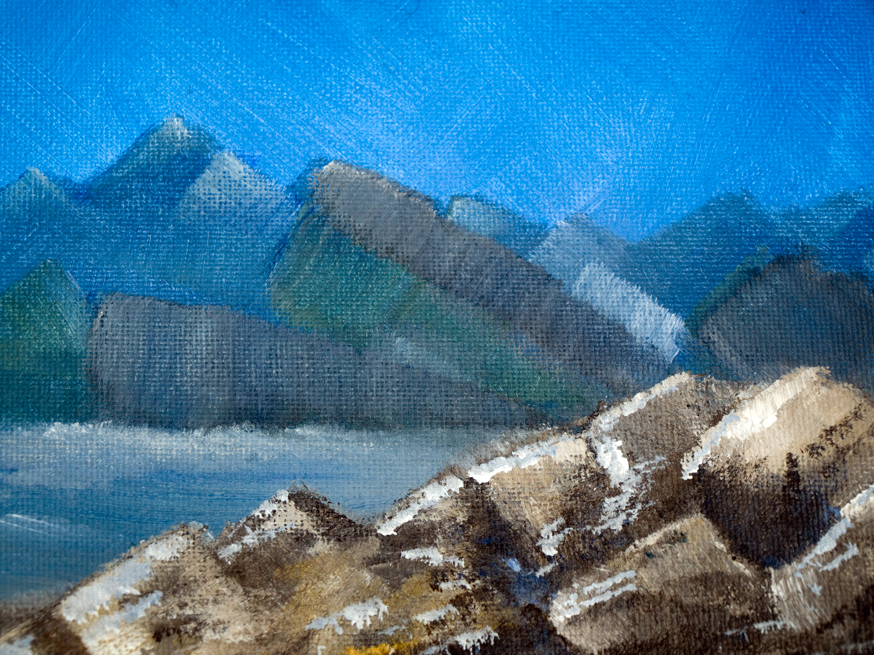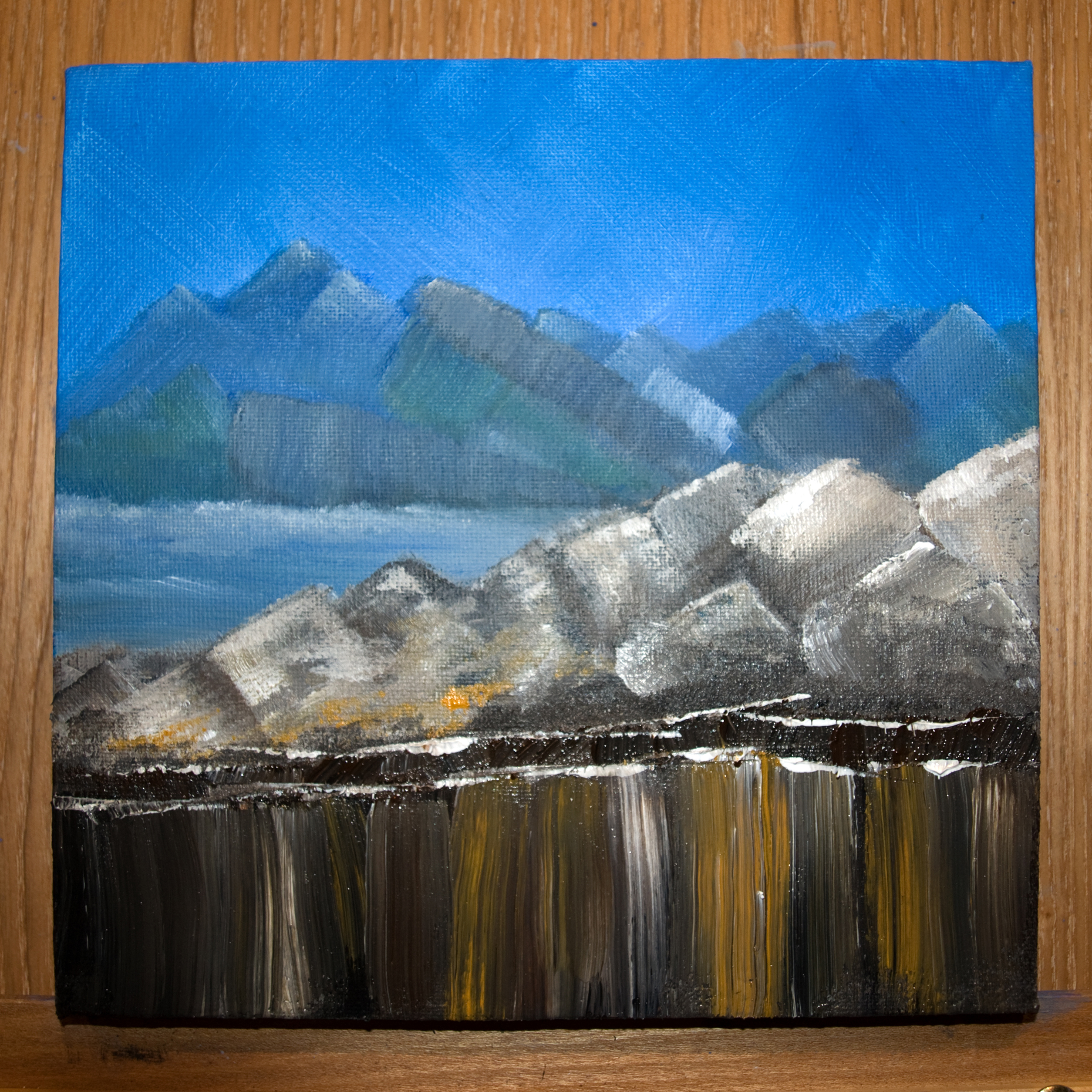 To suggest facets to the rocks, I dabbed some lines on the rocks with the edge of the palette knife and it seemed to work really well.