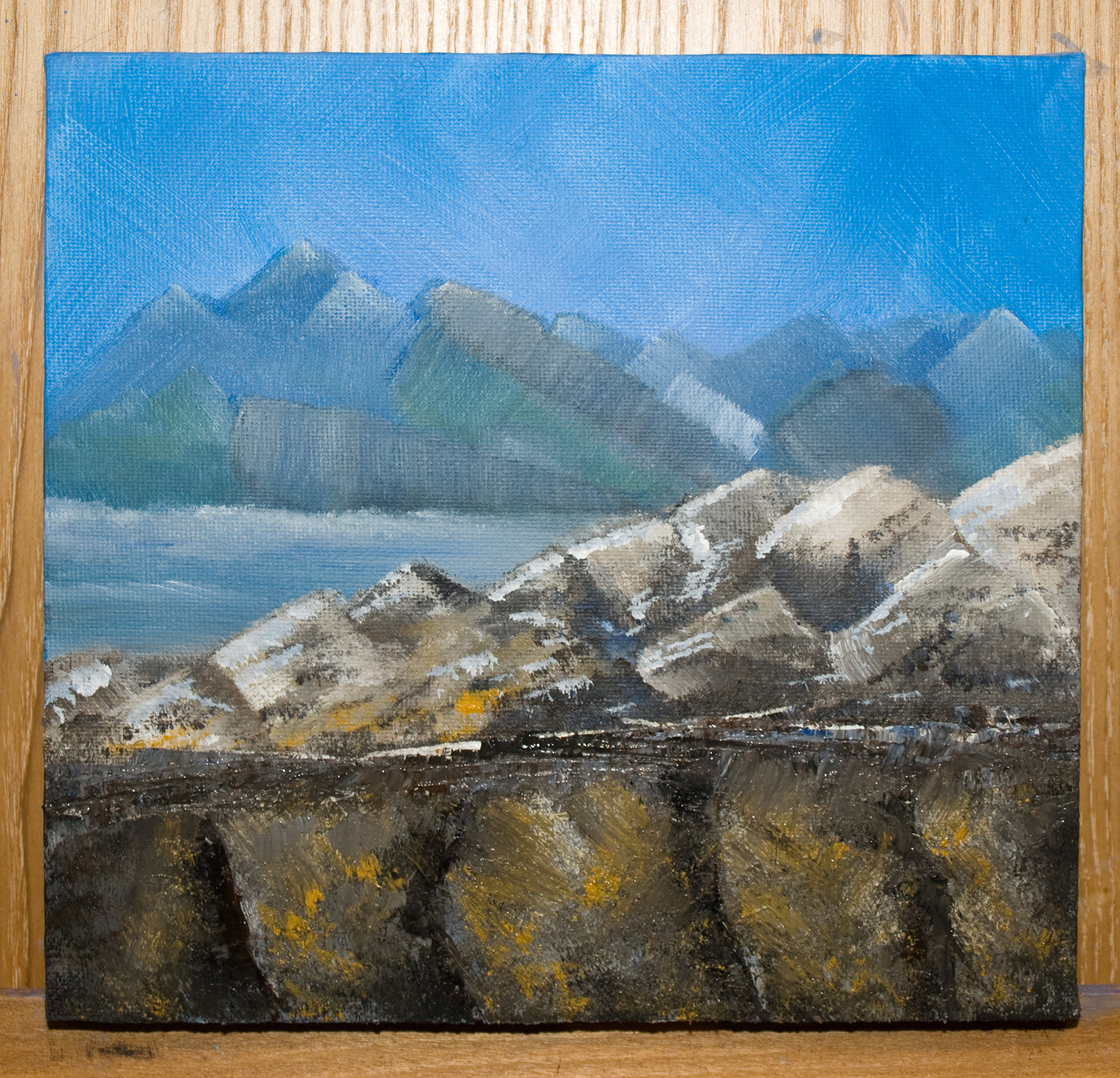 So I scrubbed and laid on more colour and tried out different brushes and palette knives until I sort of got the effect I was after. I smudged the colours in a little as the marks were a bit too defined. But I still struggled to get the front face of the lichened rock to marry with it’s top surface. Any cracks or facets to the rock were hard to get the impression of though.