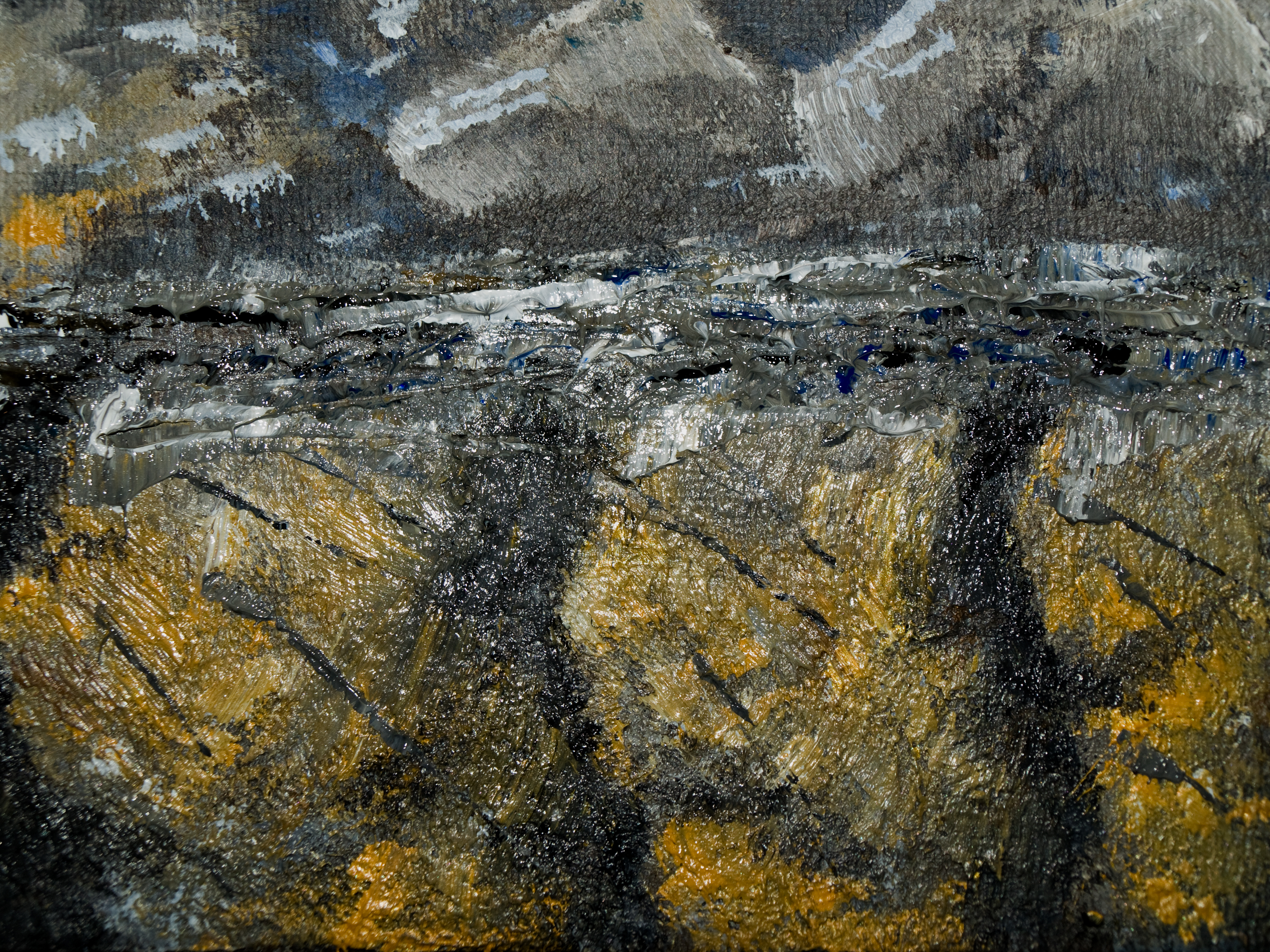 I then tried adding some blocky boulders in. But these seemed to have a mind of their own and stop being shapes and took on some light, shade and form. I then added a load of colour onto the bottom section quite thickly and dragged the colours through. I didn’t like how this worked though and overpainted it several times.