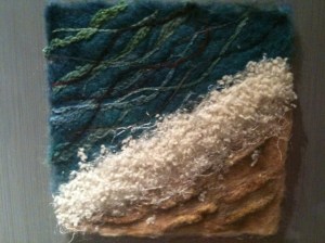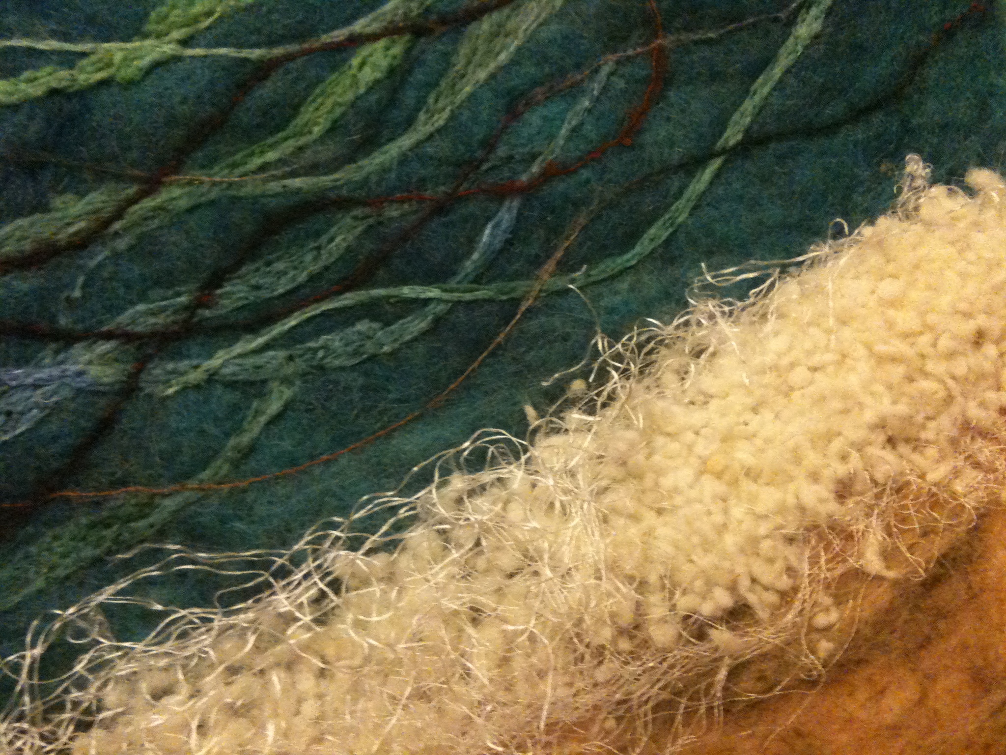 The sea has hand dyed silk fibres felted into it and mohair yarn.