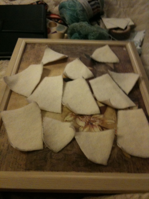 This is my frame. And how I worked out my fracture. So now I’m going to felt the fractures as a ‘whole’ piece in order to keep the sizes uniform and with ‘natural’ edges. So these pieces are my base to ensure I can make the form I want.