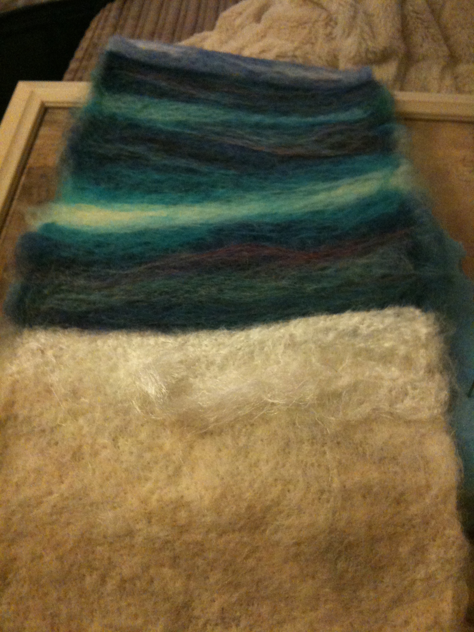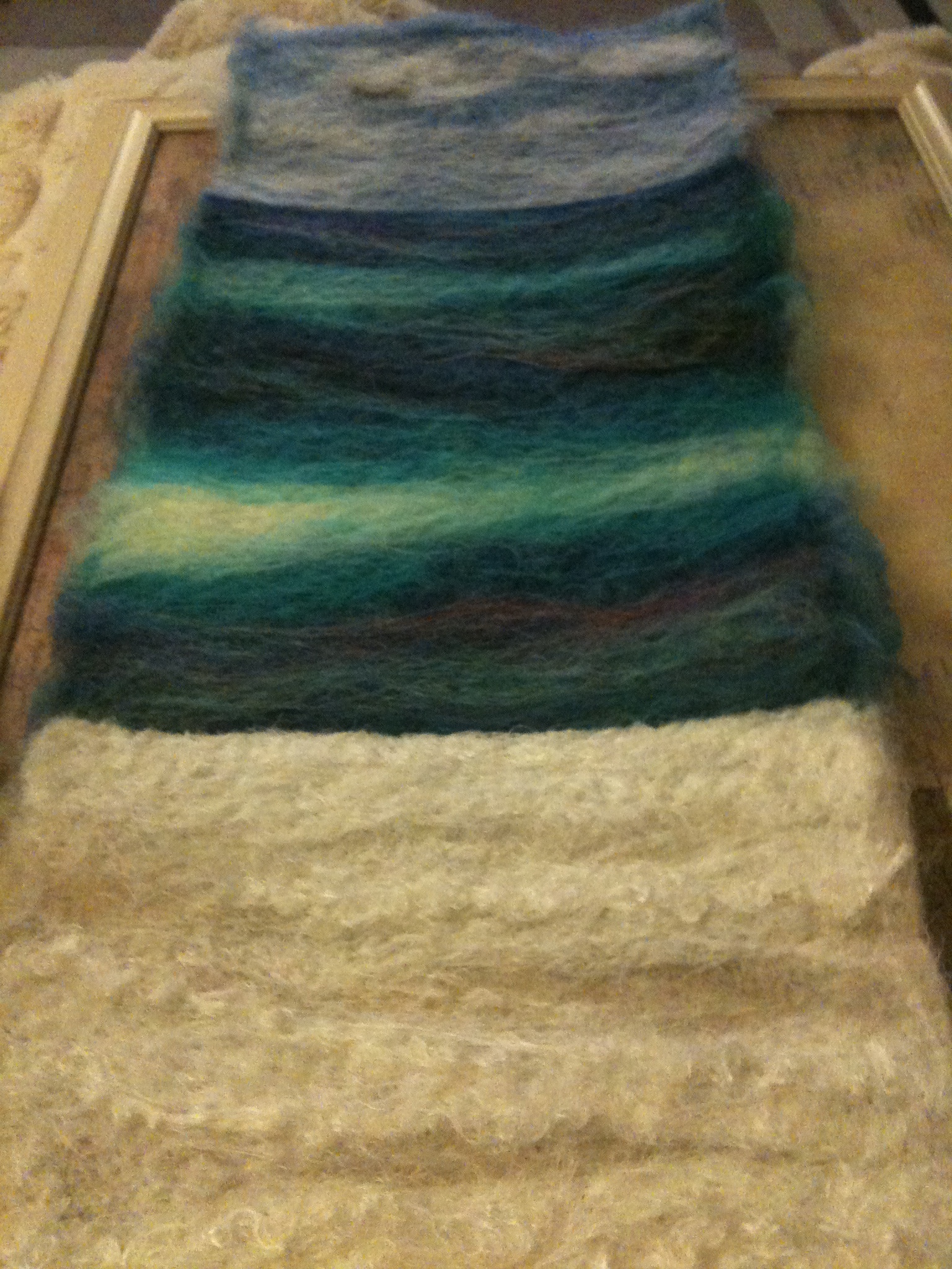 Am SO loving mixing these colours. The carding is both aggressive and soothing and mixing the colours on the card means no unnatural streaks. Still streaks in there, which is important, but when laid on by me they sometimes pinch into coal-like seams when punched in. When bedded in these streaks are natural and beautiful. Am so loving doing these triptychs. I might put them in my living room. The colours make me feel really happy and calm. It would also mean I could explore, and live with, ways of displaying my work. Each piece is 20″ tall and 7″ wide. (50 x 18cm)