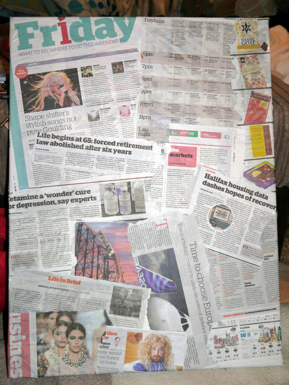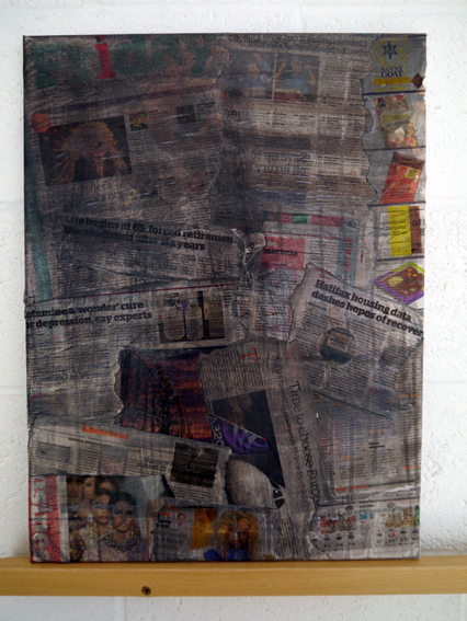 From here I bought a paper from that day – for no other reason than to create a dripping feeling with words. I began by pasting sections of that days “i” newspaper to the canvas. As I progressed, each piece related to me in some way: what I was doing or going to do; background worries or concerns; perceptions of my own body image etc.