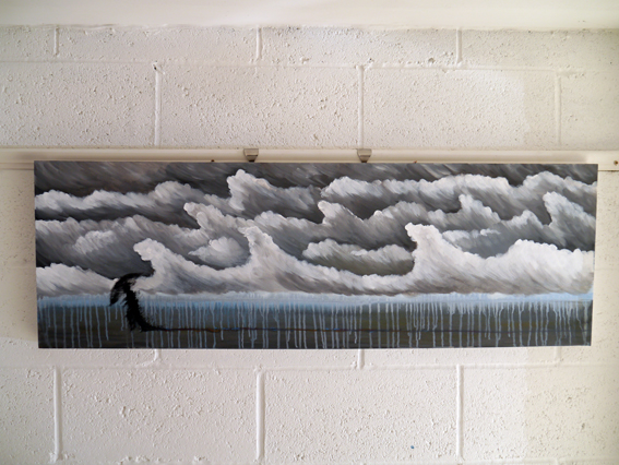 From here I tried a painting about my own struggles. I placed myself out in the landscape, with a moody sky that appeared to be preparing to eat me. I am forcing myself into the rain and pushing forward, trailing colour behind me as it drains out through the effort to struggle on. However, the clouds wind up looking quite comical and a piece of foreboding it doesn’t really work.