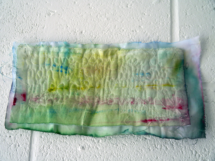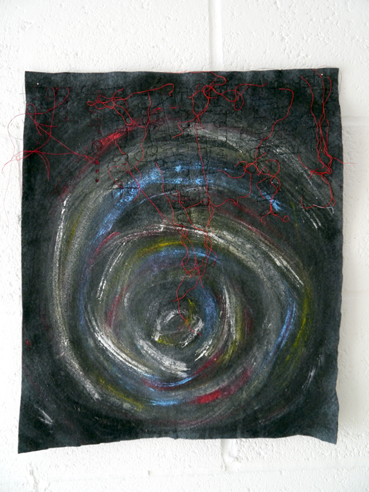 I like this piece much more. It speaks to me of domesticity. There is something about it that points me towards post-natal depression. Maybe it is because of the scale, that I could easily see this as a baby blanket or quilt. The unfinished/part-finished quality of the edges and the red thread speaks of an interruption, of despair as well as being cosy and caring. I would consider making this sort of thing on a larger scale. Perhaps as a whole or a patched version.
