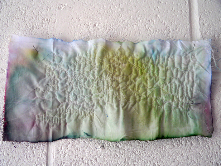I played around with painting some of the flat pieces before or after stitching and tried using some pieces with a quilted effect. I like the idea that those pieces look cosy and comforting and that the text looks like the free stitching to keep the wadding in place. But in reality the text subverts the piece into something very dark that exists by giving the impression that all is cosy and well.