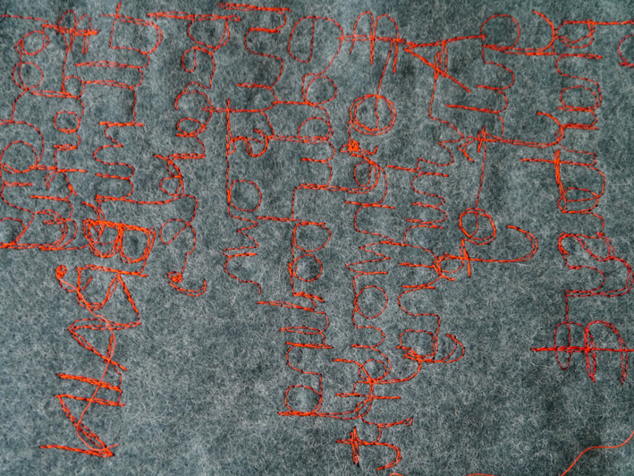 I am more interested in these. More intrigued by the way the lower thread pulls through on the stitching and how the threads hang. But, again, I find the reverse much more interesting. The words are there, but hard to read as they are reversed – so it is language, but not so. Rather like Susan Hiller’s inscription Self Portrait (1983) [P100 of The Art of Reflection, Meskimmon, Marsha – Scarlett Press, London 1996]. This then becomes more about colour, composition and emotion than it does about what the words actually say.