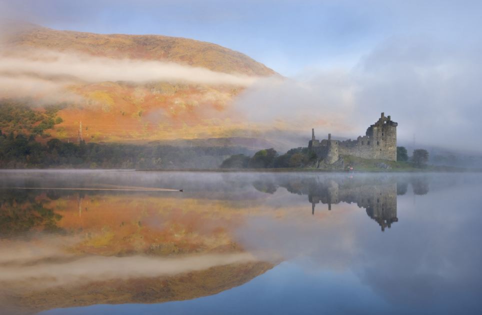 A misty morning beside Loch Awe with views to Kilchurn Castle, Argyll & Bute, Scotland. Autumn (October) 2010.