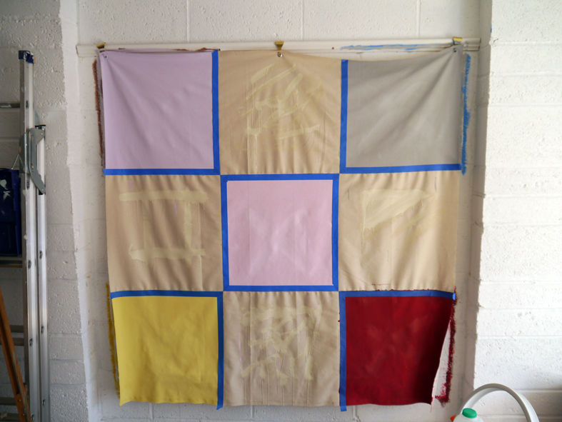 I like painting on the fabric canvas. I find the fabric more intimate and less formal than stretched canvas – it is fluid, can be manipulated by the hand, shaped, held, have things scooped onto it etc. The flapping edges also lead to an idea that this could be wrapped around you (they often curl when painted) and at times feel as though the palette is reaching out towards you, ready to envelop you when you are not looking.