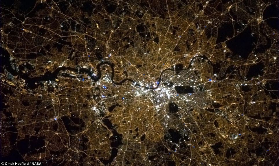 article-2319385-199E7F31000005DC-912_964x574 Published May 13, 2013 at 964 × 574 in Space Oddity ← Previous Next → The Thames can be clearly seen snaking its was through the giant urban sprawl of London in this picture ©DailyMail