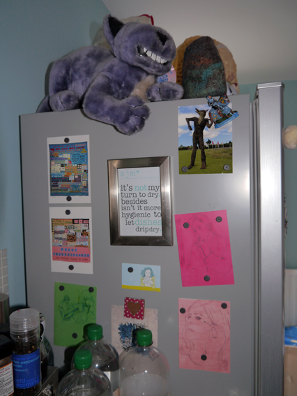 P1010765-1sm Published July 21, 2013 at 426 × 567 in Off the wall ← Previous Next → Side of my fridge. Postcards of Emin, Naomi Ryder again, Cambridge Folk Festival and William Morris – plus a quote about washing up!