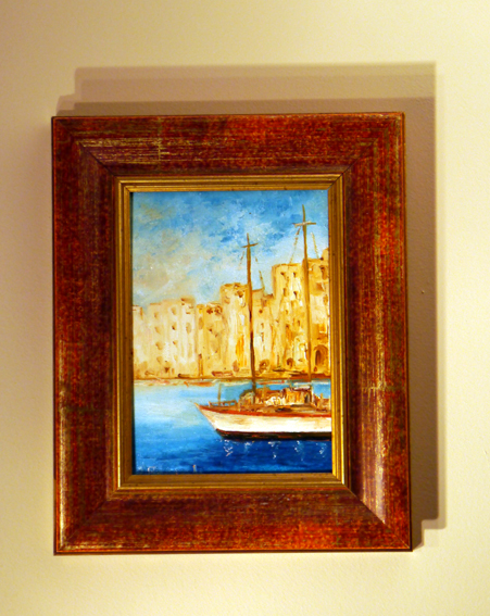 P1010786-1sm Published July 21, 2013 at 451 × 567 in Off the wall ← Previous Next → Bought this painting in Santa Margharita in Italy – just up the coast from Portofino. I love the blue against the yellow buildings and the warmth of the frame. It reminds me of glorious sunshine and happy holiday feelings.
