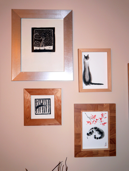 Cat and print corner. My friend Shelly did the 2 left cat prints which I love and the right 2 are Chinese brush painted cats which are created through scush economic and simple strokes. I bought them from a craft fair to represent my cats (at the time) Bob and Moomin.