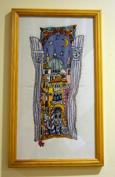 P1010850-1sm Published July 21, 2013 at 367 × 567 in Off the wall ← Previous Next → Cross stitch of a Michael Powell pattern of Venice. I love the quirky style of the drawing and the colours were so reminiscent of the place.