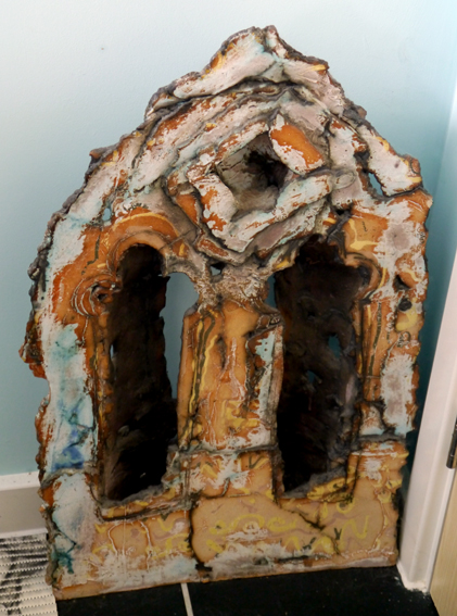 This piece was made by Sarah in my ceramics group from my BA. I love this piece because it ticks so many boxes for me. The colours are my favourite blue/green/gold combo and it is ecclesiastical in nature. I sometimes light a candle inside it as it looks stunning when lit from within. Another golden glow added to it.