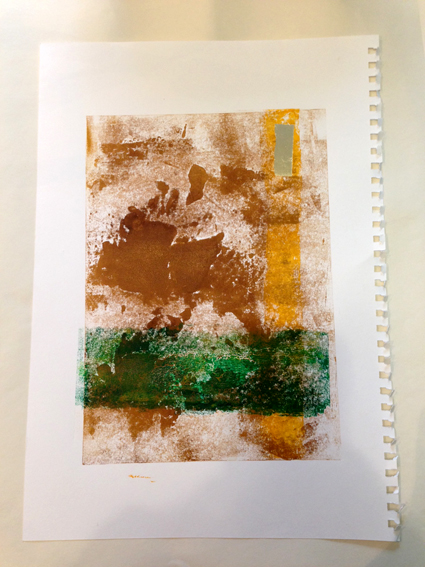 5 Published November 10, 2013 at 425 × 567 in Monoprinting experiments ← Previous Next → Reloaded plate where you can see the colour has really stuck to the extender. With gold leaf.