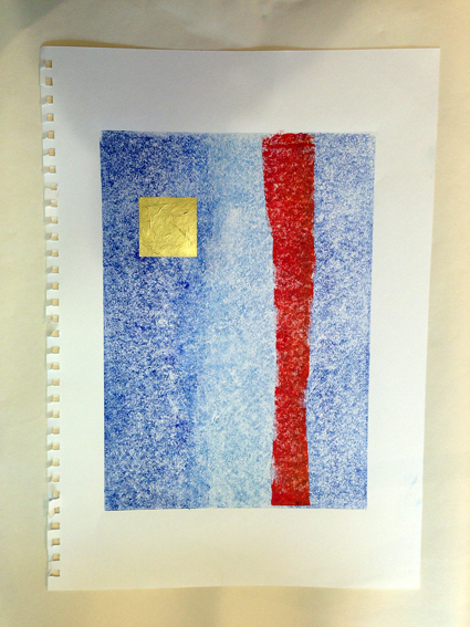 17 Published November 10, 2013 at 425 × 567 in Monoprinting experiments ← Previous Next → 5th pass with bold stripe and gold leaf block.