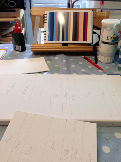 18 Published November 10, 2013 at 425 × 567 in Monoprinting experiments ← Previous Next → Small canvas, test canvas board and original diary colours behind.